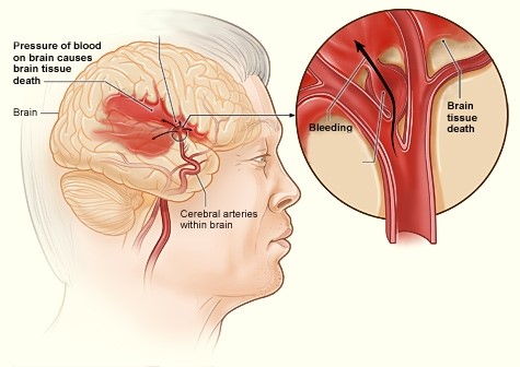 A hemorrhagic stroke occurs when an unhealthy blood vessel that supplies the brain bursts and bleeds. Brain cells and tissues begin to die from lack of oxygen and nutrients. In addition, blood leaks inside the brain causing a sudden increase in pressure which can lead to further brain damage. There are two types of hemorrhagic strokes:
