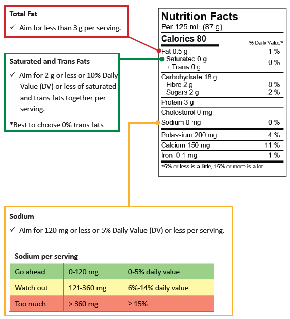 Sometimes it can be hard to know what is a healthy choice. For example, one product might be low in fat but high in salt or one may be high in fat but low in salt. The one you choose will depend on your individual needs. A dietitian can help you understand what choice to make. Ask your doctor how to get connected with a dietitian or visit Dietitians of Canada.